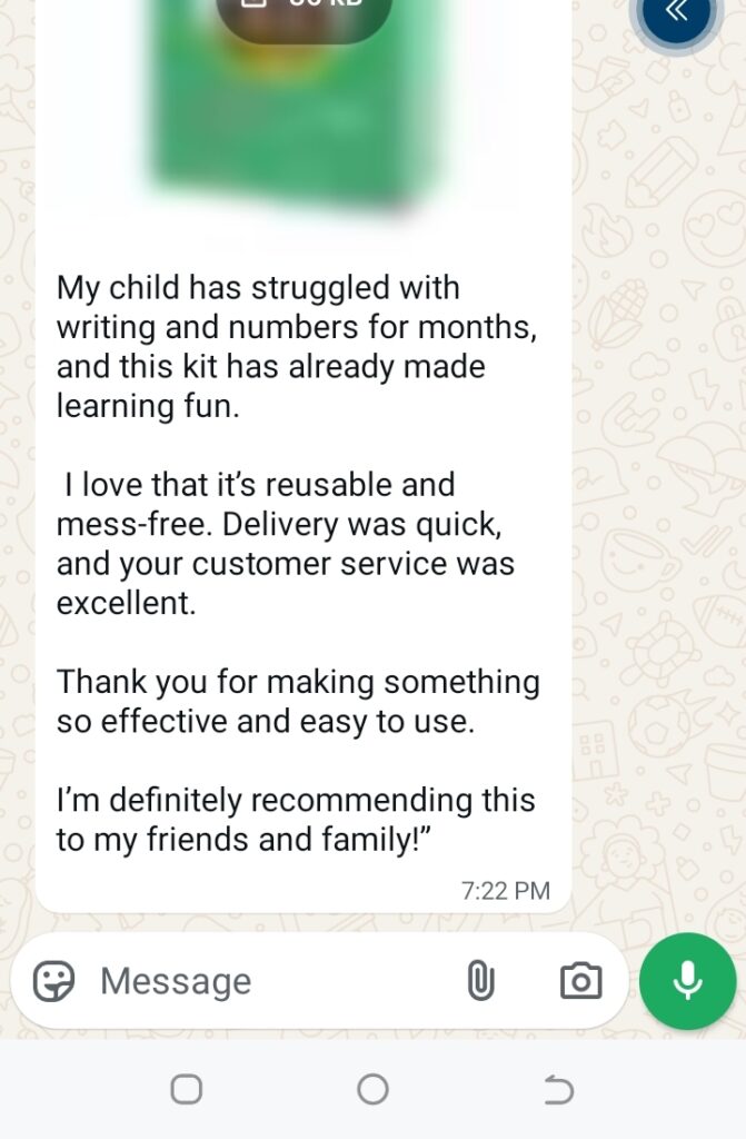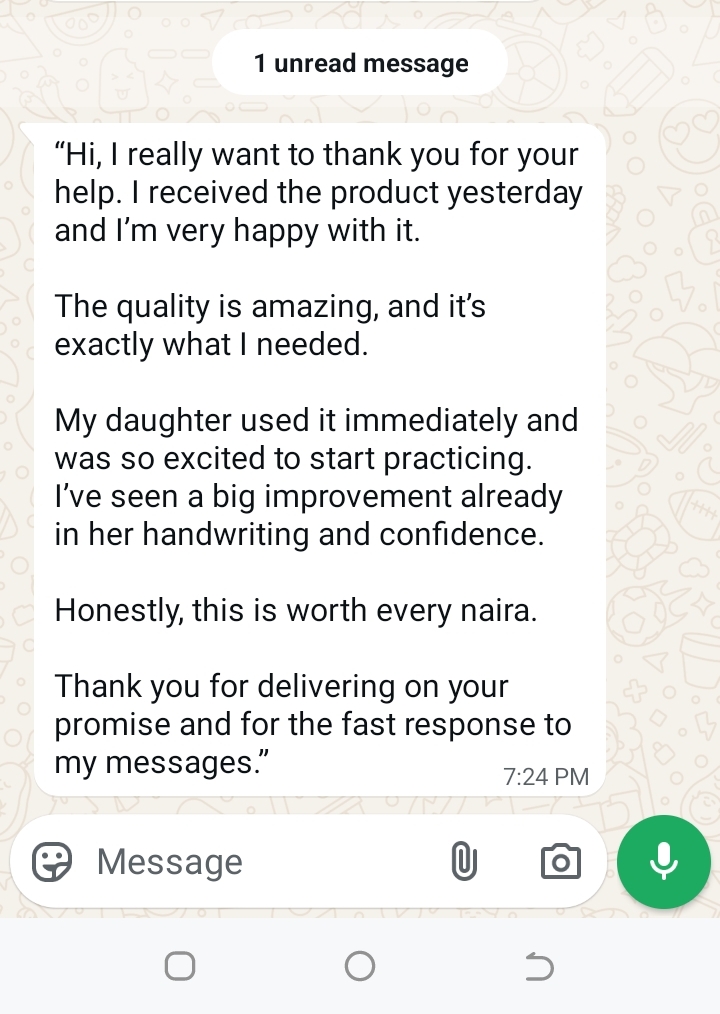 “I’ve spent so much money on extra lessons, but this kit made the real difference. My son’s handwriting improved within days, and he now enjoys practicing on his own.” – Mrs. Funke A.